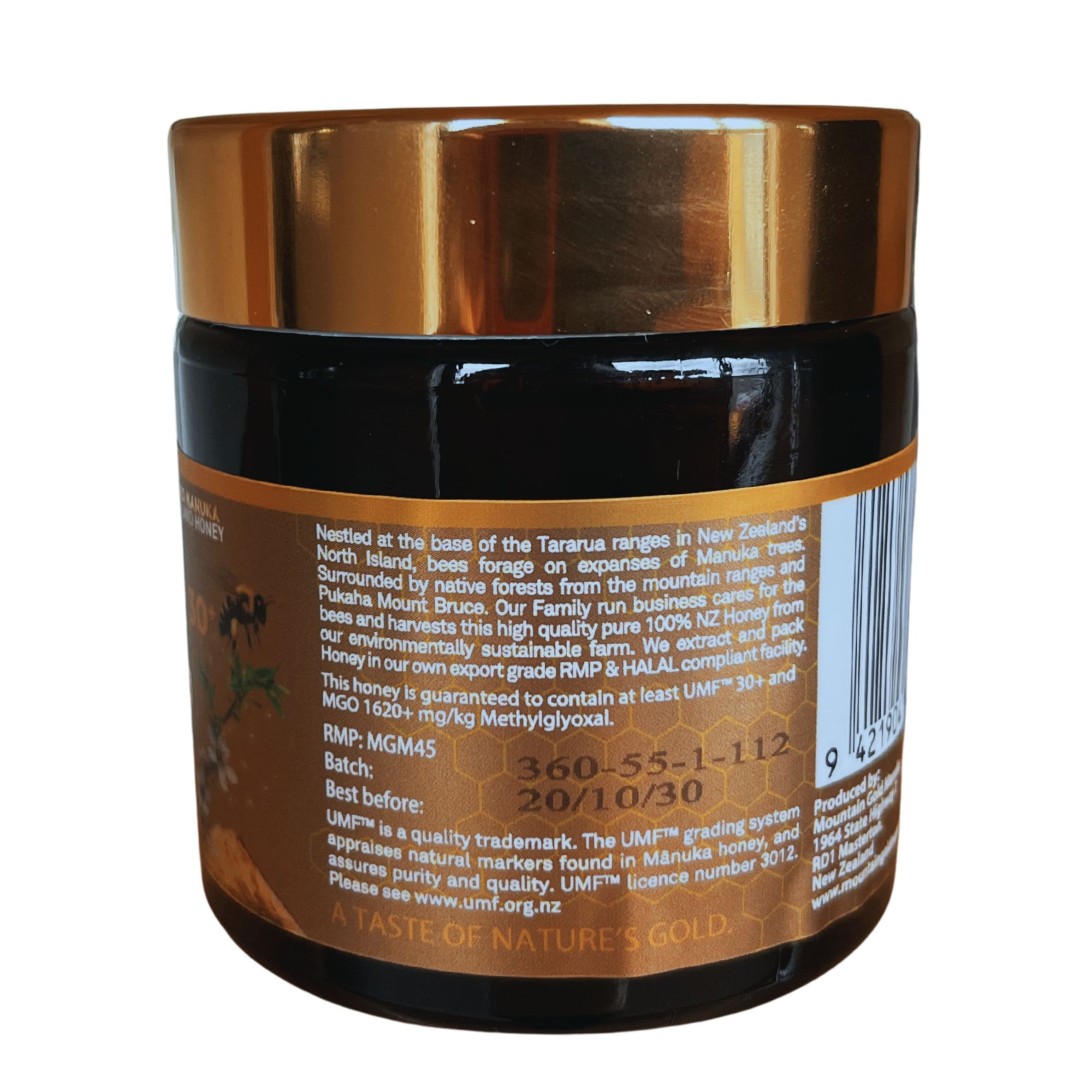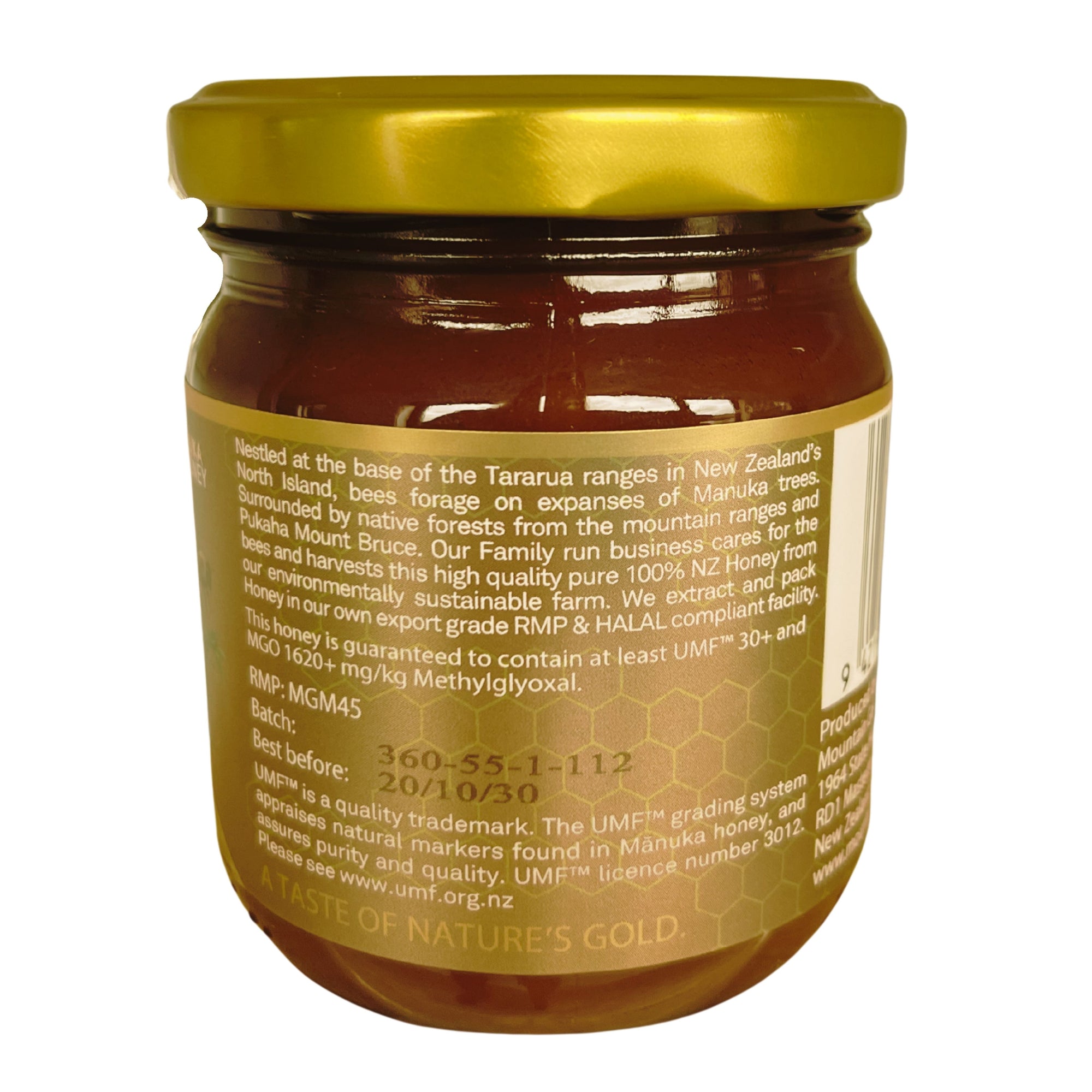 Carefully harvested and minimally processed, Mountain Gold Manuka Honey UMF™ 25+ is packed in a Halal-certified, export-grade RMP facility, with nothing added and nothing removed — just pure New Zealand Manuka honey.